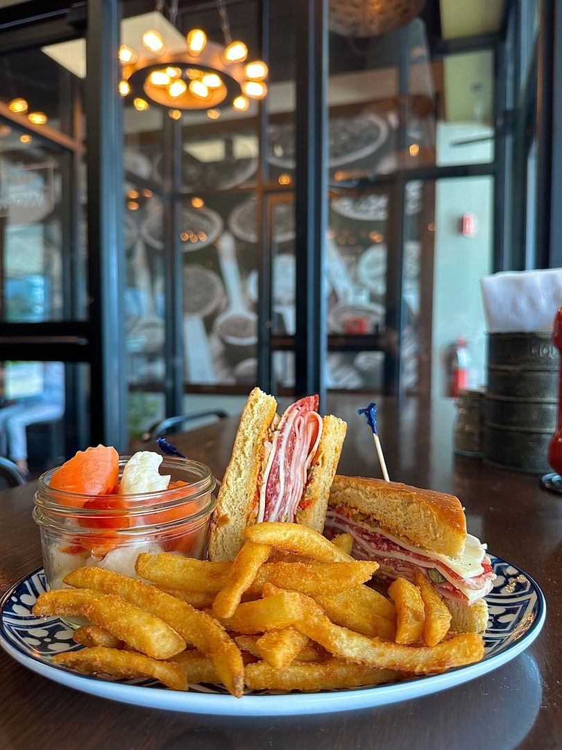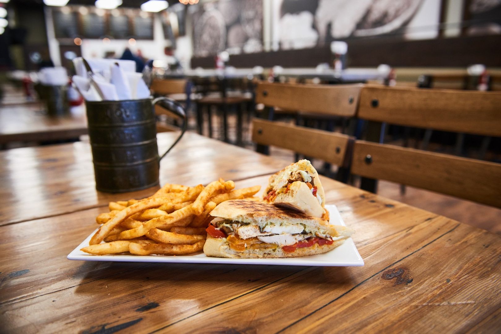 Spring Chicken – Grilled chicken, roasted red peppers, fresh mozzarella, arugula and our own olive spread all pressed in a ciabatta roll and served with crispy fries