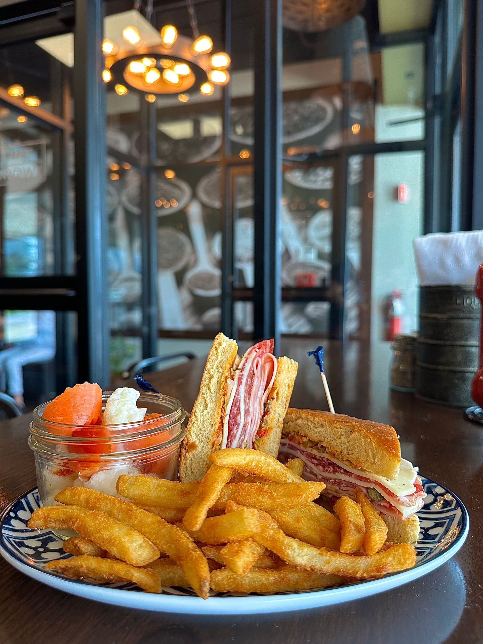 Panini: Caprese – Fresh mozzarella, tomato, fresh basil, red onion and a touch of balsamic reduction grilled in a ciabatta roll and served with crispy fries